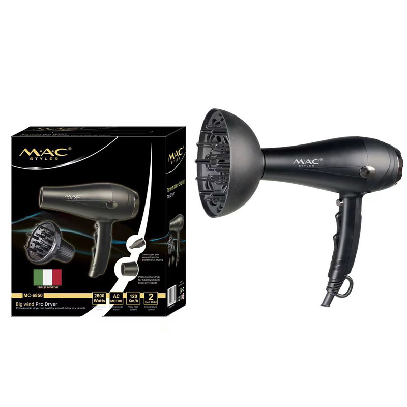 سشوار مکاستایلر مدل MC-6850 با توان 2600 وات و موتور ایتالیایی به عنوان یکی از جدیدترین ویژگیهای برند مکاستایلر در بازار عرضه شده است. این سشوار با استفاده از موتور با کیفیت ایتالیایی با توان مصرفی 2600 وات، و کیفیت اروپایی با استاندارد CE، توانسته است به عنوان یک ابزار حرفهای با اثرات حفاظتی برای موها مطرح شود. مزایایی همچون مانع خشکی و آسیب به موها، مقاومت در برابر الکتریسیته ساکن (وزی مو)، دو سرعت پرتاب باد، سه درجه دمای قابل تنظیم، دکمه کول شات (باد سرد سریع)، وزن 600 گرم، فیلتر هوای قابل جداشدن، ابزار فرم دهنده مو، فناوری تولید یون، و بازه طول سیم ۲۰۰ تا ۳۰۰ سانتیمتر از ویژگیهای منحصر به فرد این محصول محسوب میشوند. همچنین نوع موتور AC، حضور دیسپانسر، و کاربرد چندمنظوره این سشوار را برای استفاده خانگی و حرفهای مناسب میکنند. جنس المنت سرامیک تورمالین نیز این سشوار را از سایر محصولات مشابه تمایز میدهد.