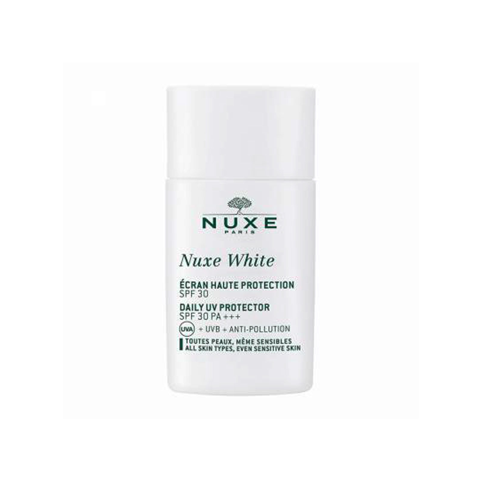 فلوئید ضد آفتاب نوکس مدل Nuxe White، مرطوب کننده و آبرسان است و از پوست در برابر اشعه UV محافظت می کند. این محصول به دلیل داشتن آنتی اکسیدان و مشتقات ویتامین E، ضد چروک است و حتی در ناحیه دور چشم نیز قابل استفاده می باشد. این ضد آفتاب فاقد رنگ است و برای انواع پوست حتی پوست های حساس هم مناسب است و دارای پودر سیلیکا با منشا طبیعی و عصاره چای سبز می باشد.